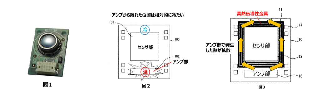サーモパイルアレイセンサ(熱エネルギー検出領域、センサ部)とアンプ部(信号増幅回路)が形成された半導体チップを有する赤外線センサ装置において、チップ内のセンサ部の周囲にCuやAlなどの高熱伝導金属膜を設けた。(図3) センサ部の周囲に高熱伝導性金属膜を設けることで、アンプ部で発生した熱は高熱伝導性金属膜を通じて拡散され、センサ部の温度が均一となって熱エネルギー検出による温度測定が高精度となります。