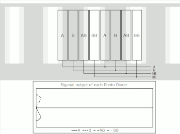 受光素子はA相、B相、AB相、BB相信号用の4種をペアとして複数のペアがアレイ状に配置されています。 出力信号は同じ位相信号用の複数の受光素子の出力を平均して生成されるため、スケールやIC表面の汚れなどによる部分的な光量変化の影響を受けにくくなっています。