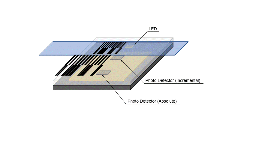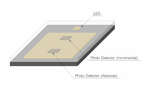 ICパッケージには、発光用のLEDと受光用のICが内蔵されており、LEDから出た光はスケールで反射し受光素子に入射します。 データシートに記載されている様にスケールとICを配置することで、インクリメンタルパターンとアブソリュートパターンで反射したスケール上の明暗パターンは、インクリメンタル信号用受光素子およびアブソリュート信号用受光素子面に、2倍の大きさに拡大投影される様に設計されています。