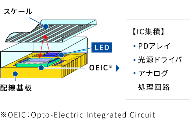 スケールは反射/非反射のパターンが交互に連続しており、スケールが動くことによってOEICが受光する光量が変化し、それによって移動量を検知しています。