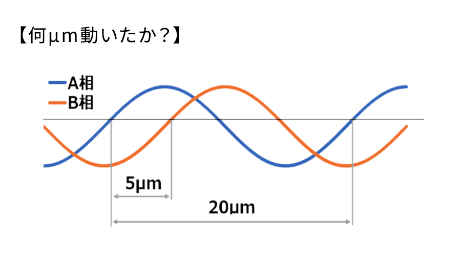 信号(周期)をカウントすることで移動量の検知が可能。例えば30周期動作したとすると20umX30周期=0.6㎜となります。【アプリケーション例】