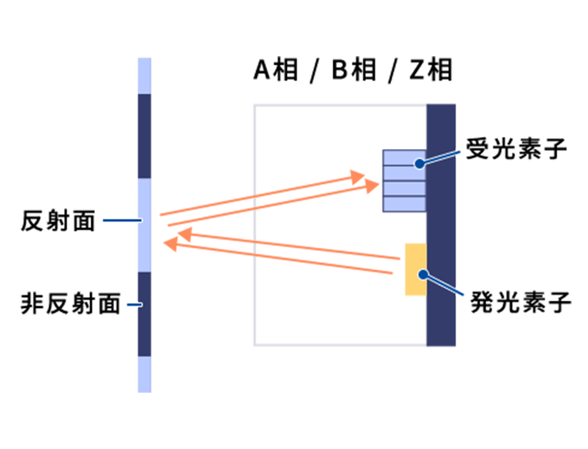 発光素子と受光素子を同一の平面上に配置し、スケールで反射した光を受光。当社の光エンコーダは、反射型のエンコーダです。