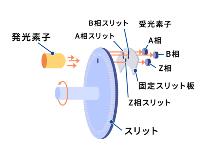 発光素子と受光素子でスケールを挟み込みスリットをすり抜けた光を受光。